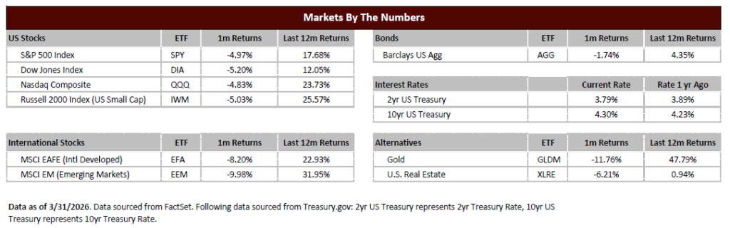 The S&P 500 fell 4.97% during the month, dragging both quarterly and year-to-date performance into the red, with a decline of 4.63%[1], through the first three months of the year.