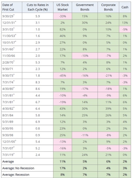Over time, monetary policy has consistently demonstrated its ability to shape market trajectories. In the early 1980s, Paul Volcker’s aggressive rate hikes ultimately broke the back of inflation but triggered significant volatility for both equities and bonds. Conversely, the post-2008 era of near-zero interest rates and quantitative easing fueled one of the longest bull markets in history by lowering the cost of capital and supporting risk assets such as the stock market. The chart below shows performance 12 months after the first rate cut for the S&P 500 (US Stock Market) and different bond types.1