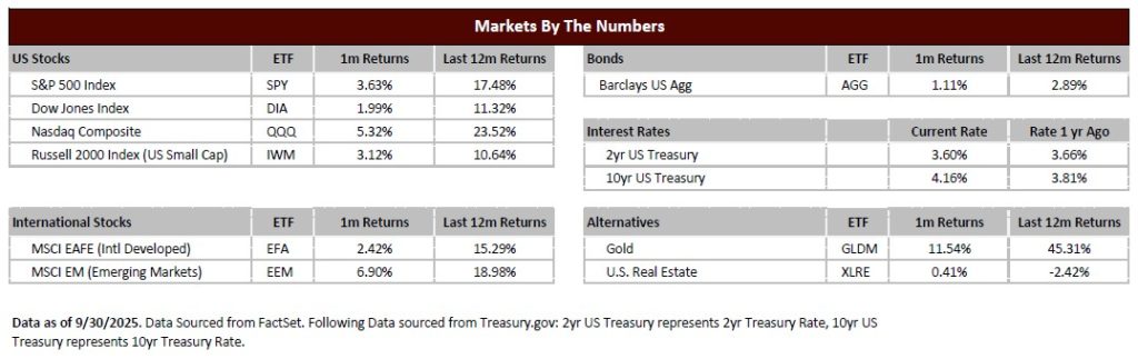 Historically, September has been the worst month of the year for the stock market, as measured by the S&P 500. After a weak start to the month, it appeared history might repeat itself, but investors were in for a pleasant surprise. The markets rallied throughout September, finishing up over 3% for the month, marking the fifth consecutive month of positive returns and defying the seasonal pessimism that typically accompanies this period.