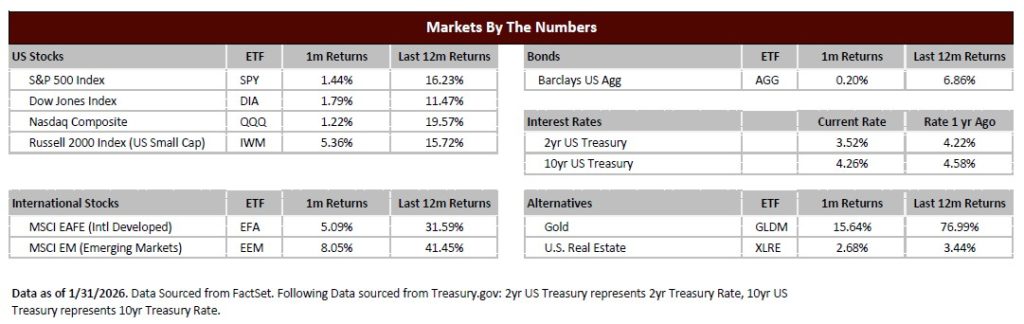 Looking ahead, our outlook for 2026 remains constructive, though investors should prepare for continued volatility. The foundation for sustained market strength appears solid, supported by healthy earnings expectations, resilient consumer spending, and a robust economy. January exemplified what we expect going forward: positive performance punctuated by periodic volatility. Rather than viewing market fluctuations as cause for concern, investors should recognize them as a natural feature of a broadening, maturing bull market. The diversification of leadership across market caps, geographies, and sectors suggests the rally is gaining depth and durability, characteristics that historically have supported longer-term appreciation. While short-term uncertainty is inevitable, the underlying economic fundamentals and market breadth provide confidence that 2026 can build on the momentum established in this encouraging first month.