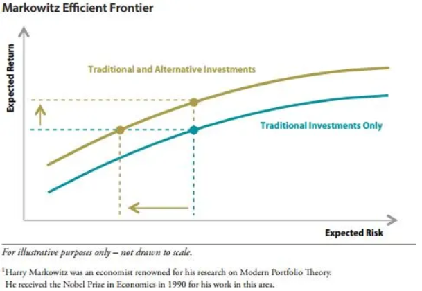 Buying alternative investments usually creates diversification benefits and, as a result, are able to lower volatility and provide a degree of downside protection when markets are not doing as well. The chart below2 shows the added efficiency of holding alternatives in a portfolio.