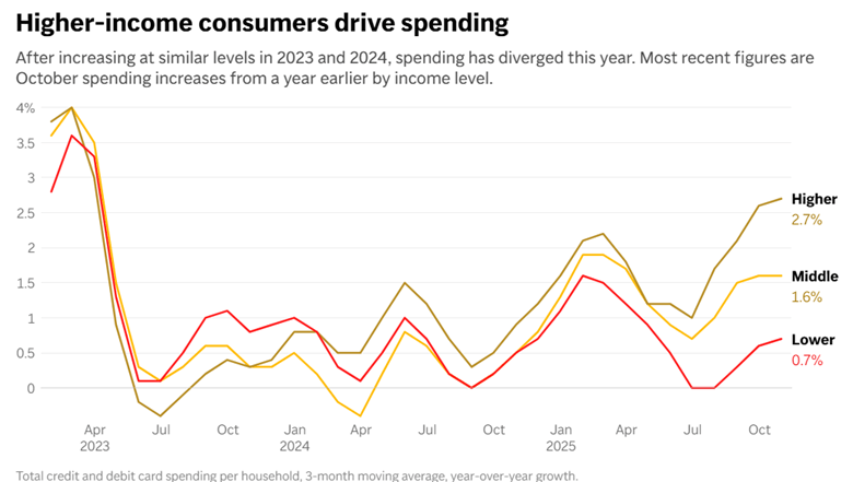 We believe this divergence will be a critical theme to watch in the coming year. A broadening economic slowdown could pressure the top of the K, while potential policy changes, tax refunds, or interest-rate adjustments may offer support to the bottom. As always, we will continue monitoring the data and corporate insights to assess whether consumer resilience can hold across all income groups…or whether the widening gap becomes a more meaningful headwind for economic growth in 2026.